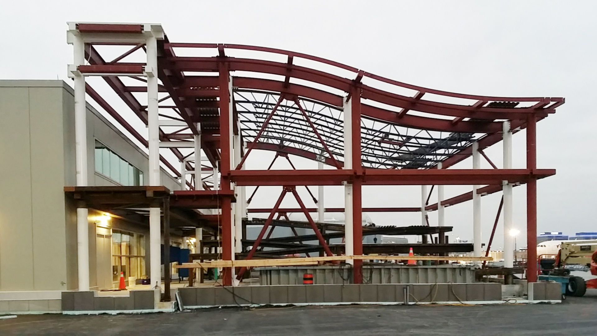 This contract involved the construction of five gate pods with glass-clad passenger boarding bridges and an addition to the building featuring an architectural curved roof structure. An electrical building and an outbound escalator building were also constructed. Renovations included selective demolition, removal, patching, and repairing existing building components and systems.