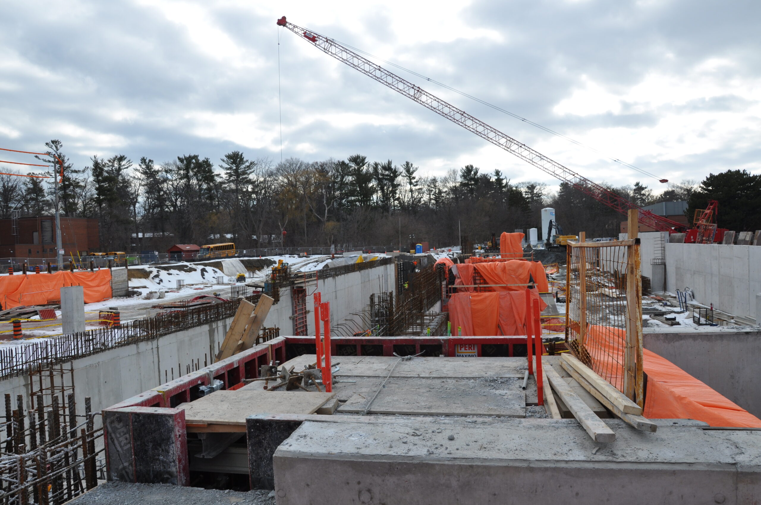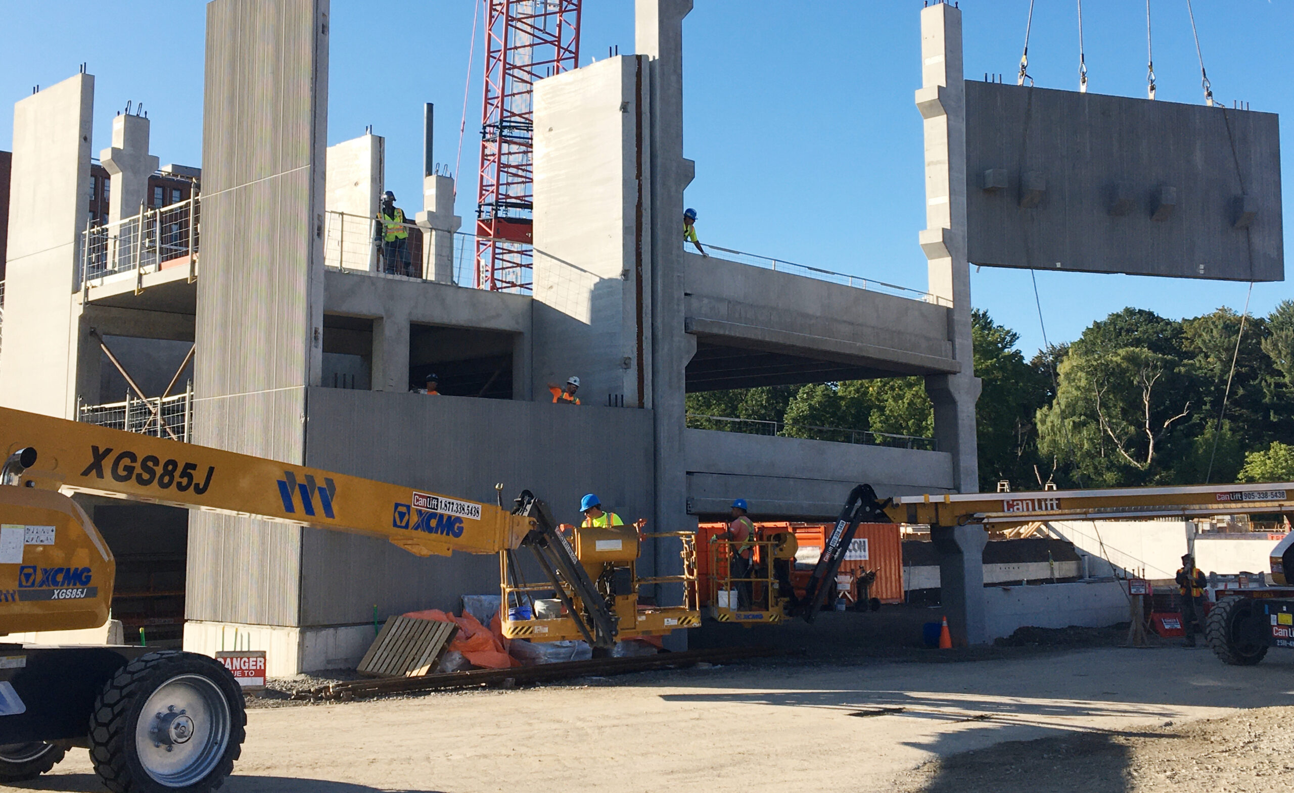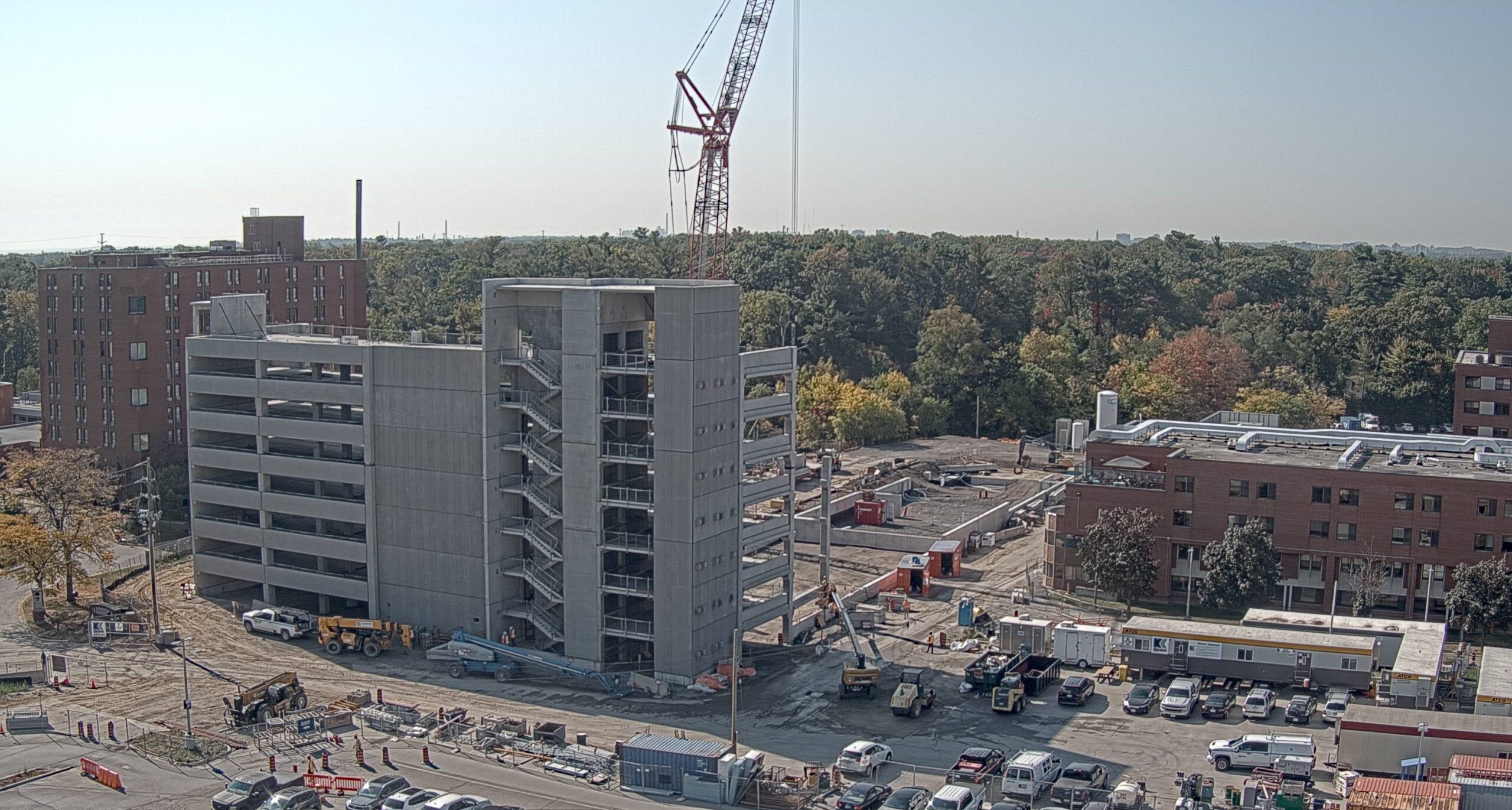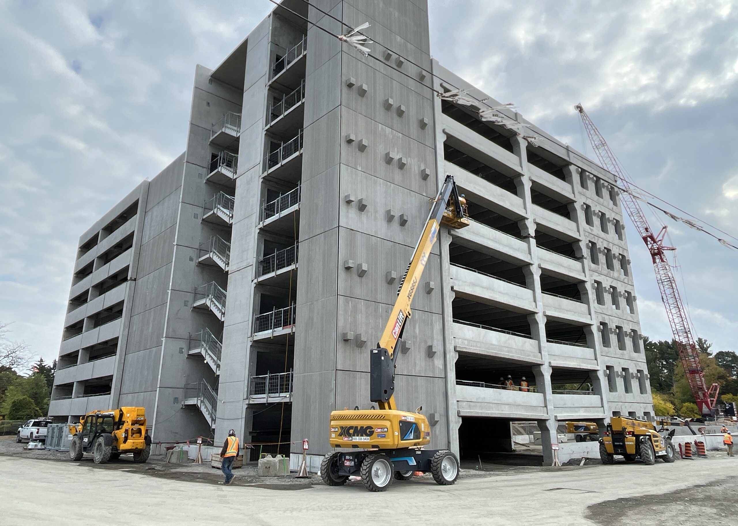 A cast-in-place foundation will support the 8-level precast garage. Construction includes structural considerations for a pedestrian bridge, future expansion, and an underground loading dock connection.