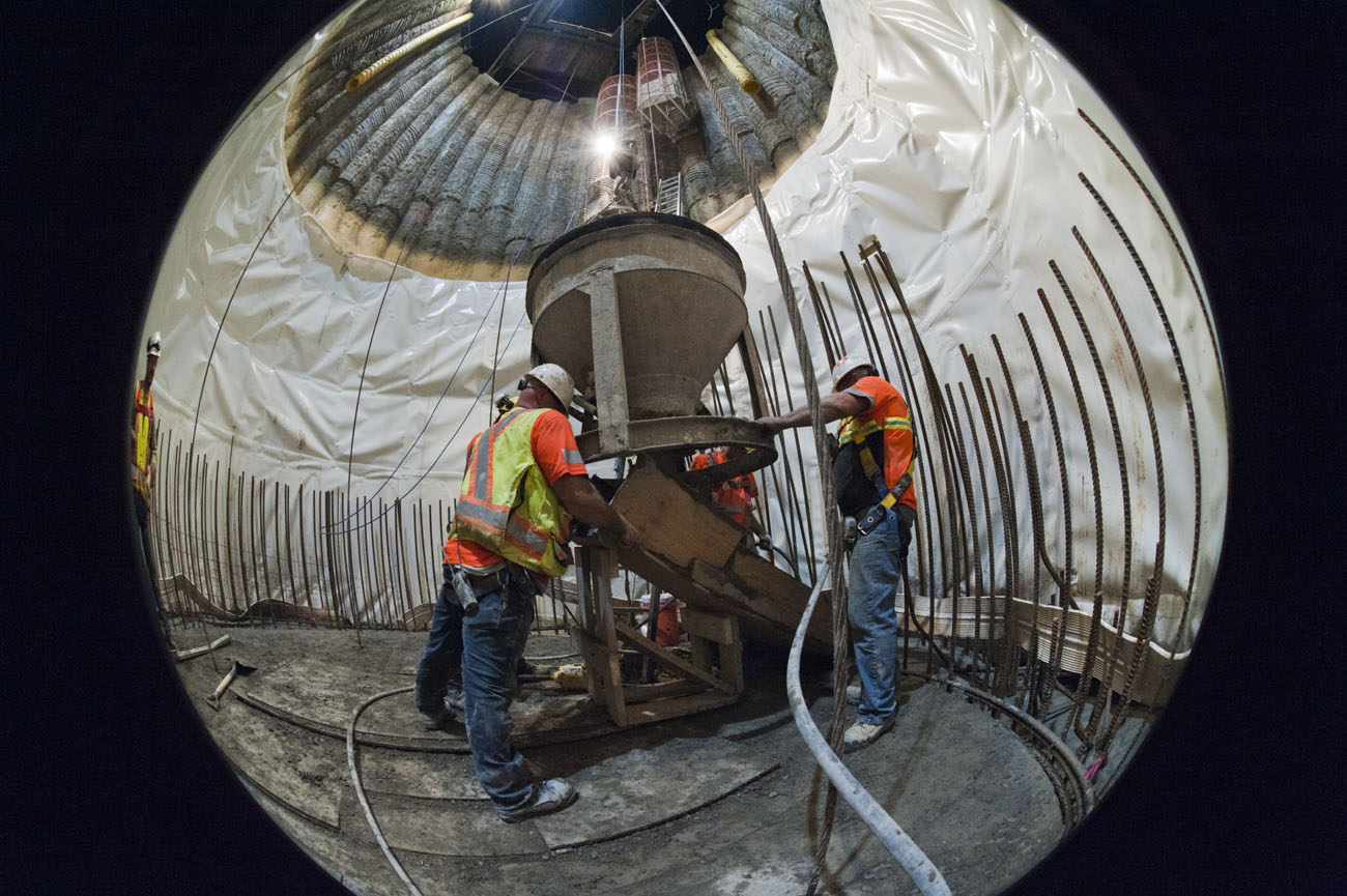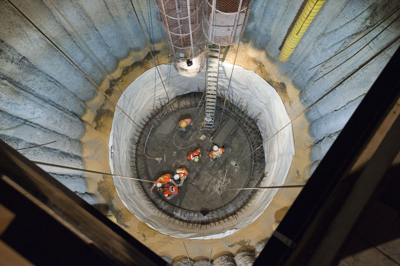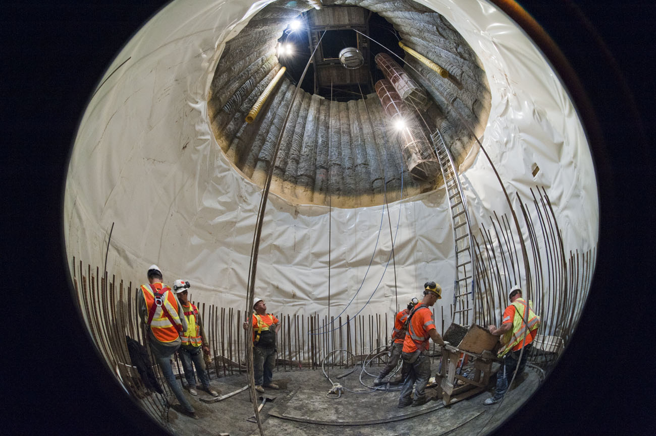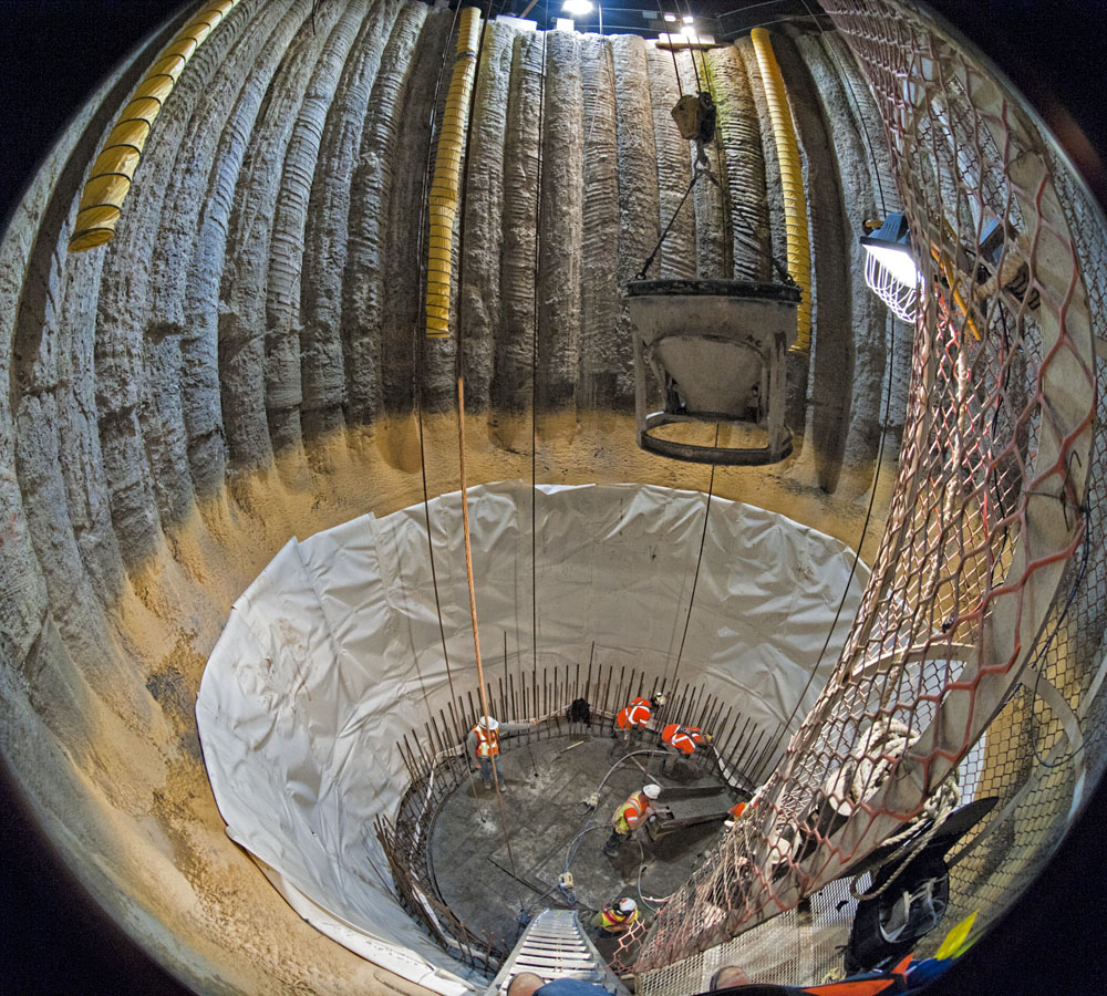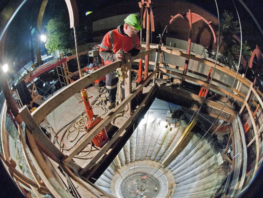 The work on the Fort York walls consisted of piles and caissons running parallel with the tracks for 115 metres. The second part of the project involved two shafts on either side of the tracks, 20 metres deep and 5 metres in diameter, connected by a 55-metre-long and 3-metre diameter tunnel under the tracks. The tunnelling began from the north shaft while work continued in the south. The shafts were built using a slip-form technique.