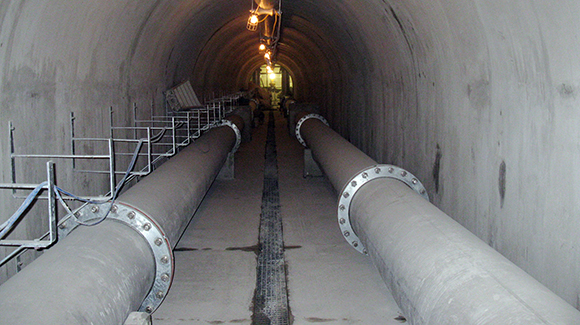 The mechanical work consisted of two 600 mm stainless steel force mains, a 300 mm stainless steel watermain, and four 100 mm Bell conduits. All of these run the complete length of the tunnel and raise the shafts at each end, terminating outside for future connection.
